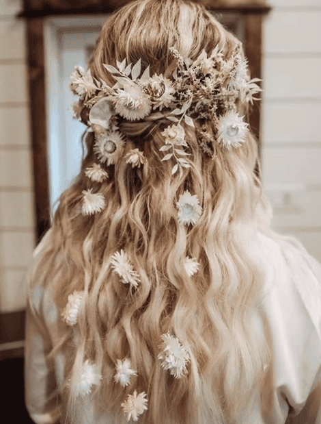 If you are dreaming of a boho wedding day then this dried white ivory real flower hair comb wedding hair accessory is definitely something to consider! Check out this unique hair accessory out here on Etsy.