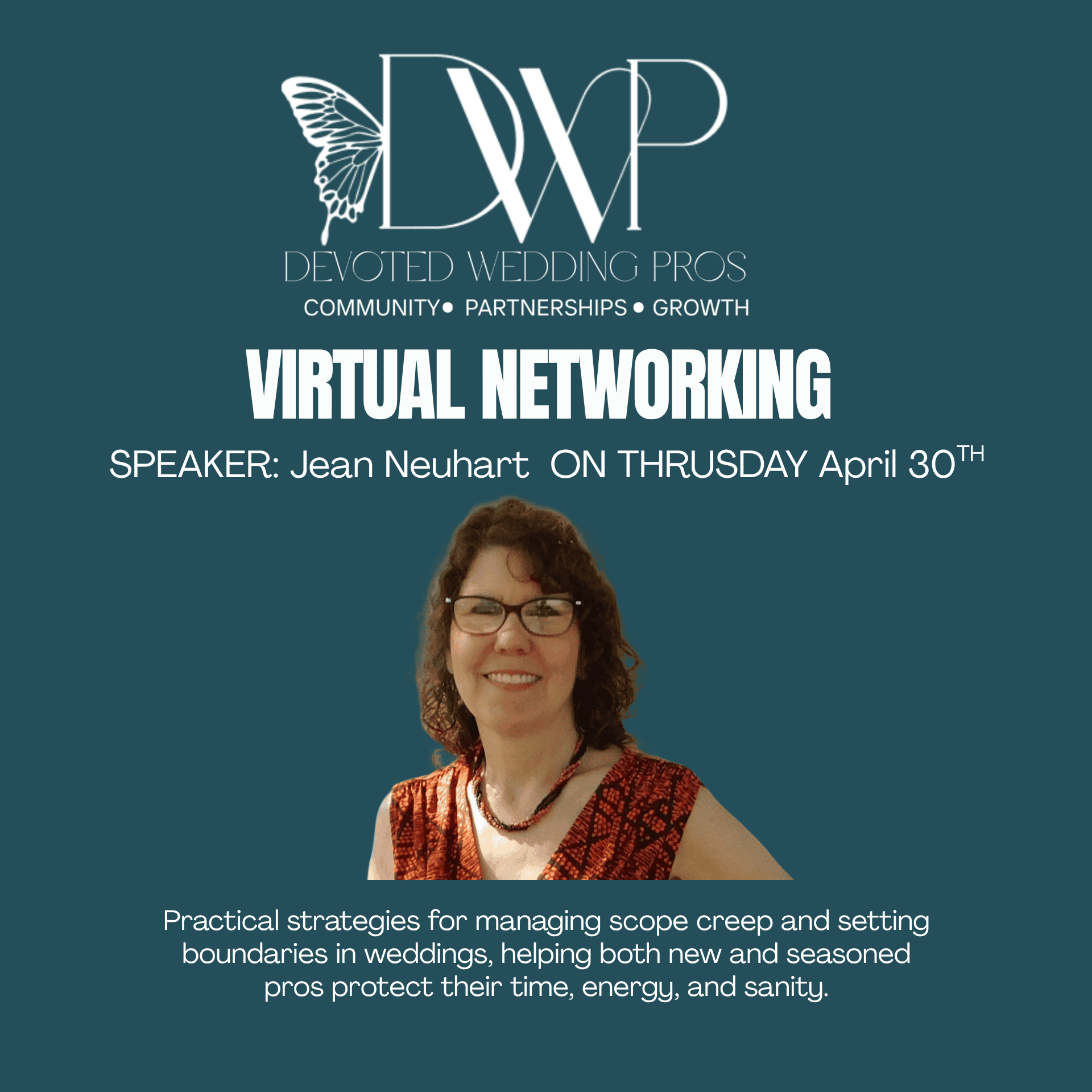 Devoted Wedding Pros Virtual Networking This Month Topic: Scope Creep & Boundaries—avoiding the rabbit and crow. Practical strategies for managing scope creep and setting boundaries in weddings, helping both new and seasoned pros protect their time, energy, and sanity. Speaker: Jean Neuhart from Weddings from the Heart Bio: Wedding specialist helping couples make sense of wedding planning—without the nonsense. With over 30 years in the industry, I share practical insights and stories that wedding professionals can relate to. Learn More: https://weddingsfromtheheartblog.net/ Monthly Meet-Up Overview Devoted Wedding Pros Virtual Networking is a monthly online connection and education event for Ohio wedding professionals who want more referrals, better relationships, and a stronger local network. It’s structured, welcoming, and you’ll actually meet people. What to expect Quick welcome + easy instructions Guided introductions (short, not awkward) Mini education moment + discussion Community share + asks (referrals, shout-outs, opportunities) Wrap-up with next steps so you know who to connect with after Who it’s for Ohio wedding professionals in any category. Planners, venues, photographers, DJs, florists, rentals, hair + makeup, bridal, officiants, videographers, transportation, stationery, and more. How to join Register ahead of time and we’ll email the Zoom link and simple login instructions before the event. CLICK HERE